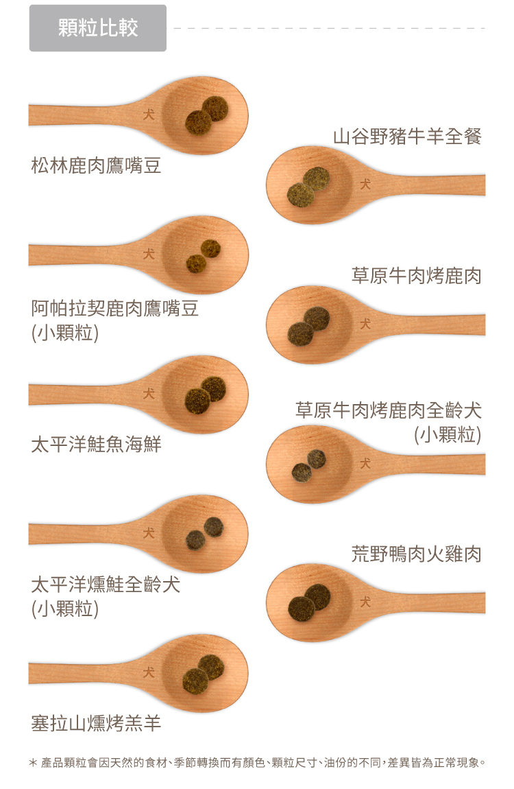 【成份介紹】草原放牧新鮮鹿肉(10%),脫水羊肉,鷹嘴豆(10%),豌豆,小扁豆,豌豆蛋白,菜籽油,蛋製品,脫水鴨肉,豌豆粉,蕃茄渣,脫水海魚(鲱魚),礦物質,乾菊苣根,蕃茄,藍莓,覆盆子,絲蘭萃取物。