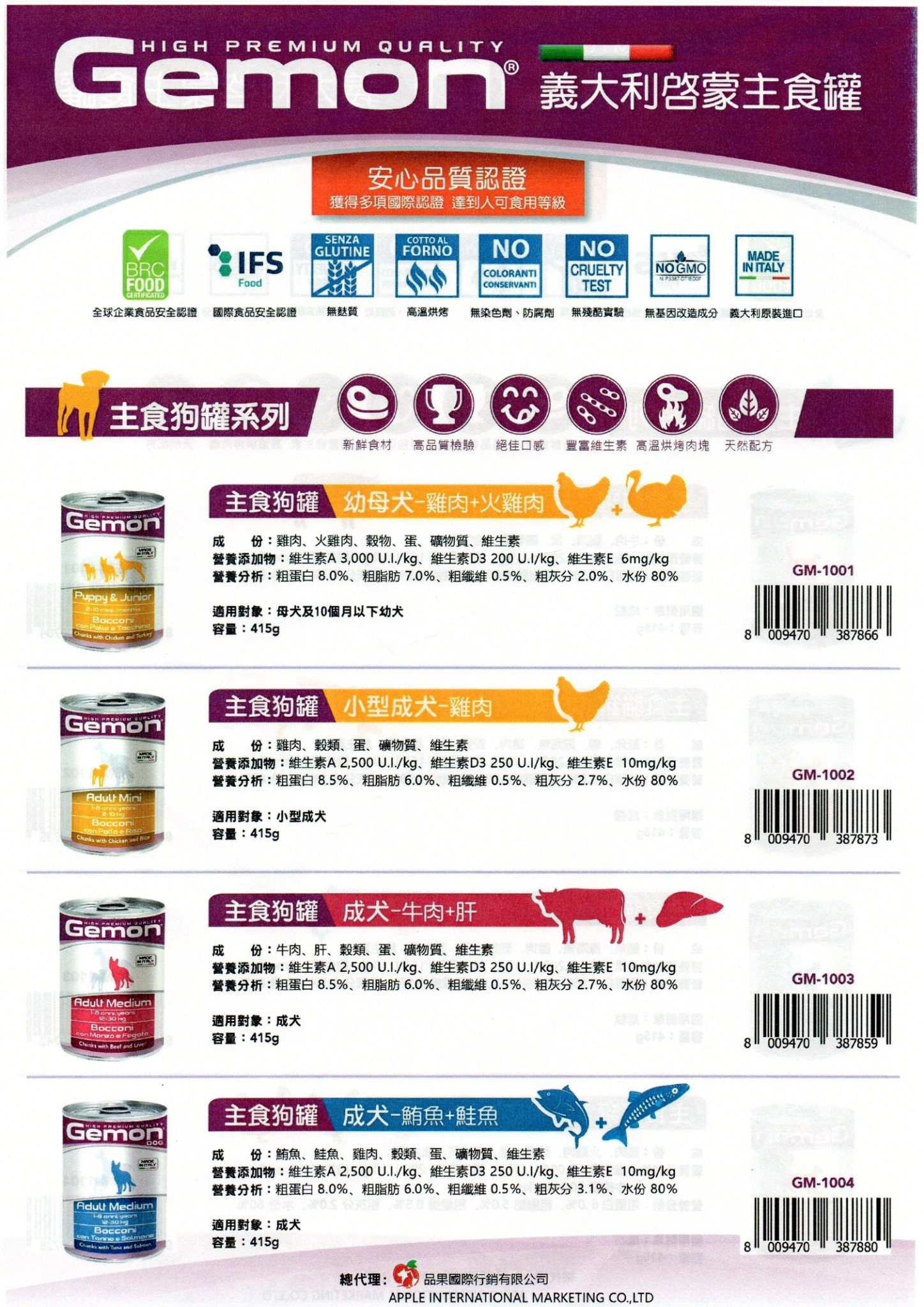 12入混搭-義大利GEMON啟蒙主食狗罐頭415g 4種口味