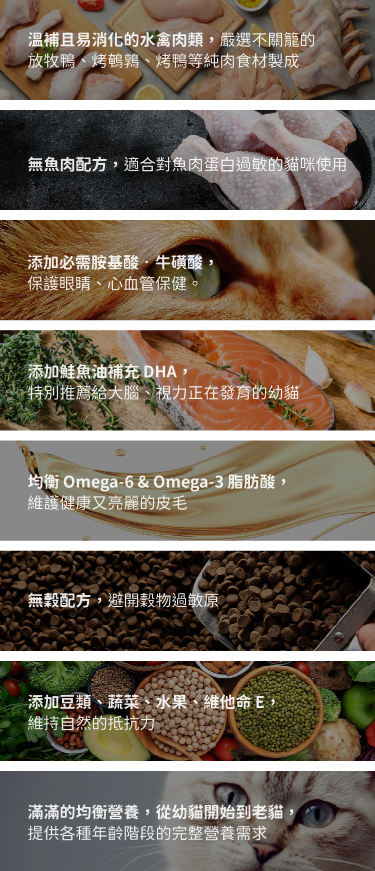 無穀類添加地瓜及蕃茄配方,提供給好動的貓容易消化吸收的活力源。